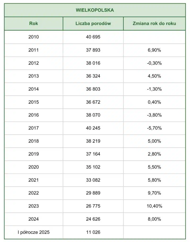 Liczba porodów w Polsce spada – jest to temat bardzo gorący w ostatnich latach. Gdy przyjrzymy się liczbom od 2010 r., stały spadek urodzeń z okresu na okres zauważalny jest od 2018 roku. Poniżej znajdują się tabele z liczbą porodów dla Polski oraz Wielkopolski. Widać na nich, że nasze województwo nie odstaje od średniej ogólnopolskiej. Gdyby porównać dane z roku 2024 versus 2010, to spadek liczby porodów wynosi 39,5% dla Polski i 39,4% dla Wielkopolski. Jest to ciekawa informacja, biorąc pod uwagę zamykające się u nas porodówki, których w ciągu zaledwie kilku lat ubyło już 9 – więcej niż w większości pozostałych województw.