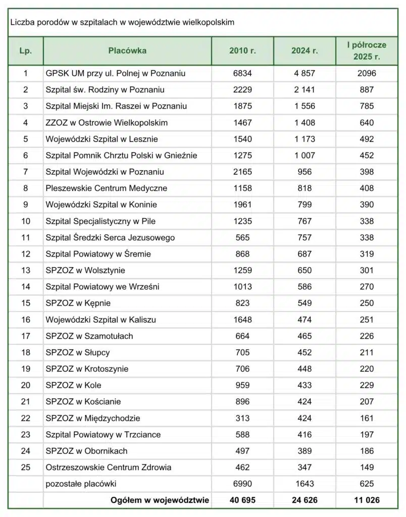 - Wiersz “pozostałe placówki” w tabeli odnosi się do oddziałów porodowych, które w ostatnich latach zostały zamknięte lub zawieszono ich działalność, m.in. Złotów, Jarocin, Wągrowiec, Grodzisk Wlkp., Turek, Rawicz, Nowy Tomyśl.
