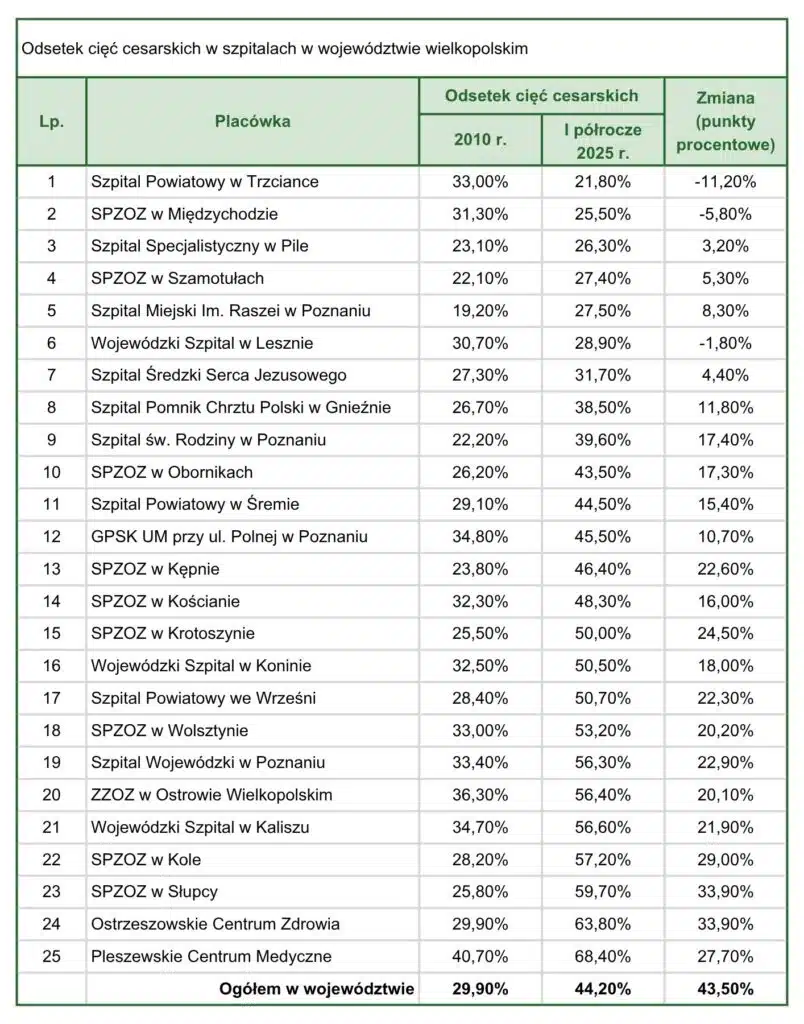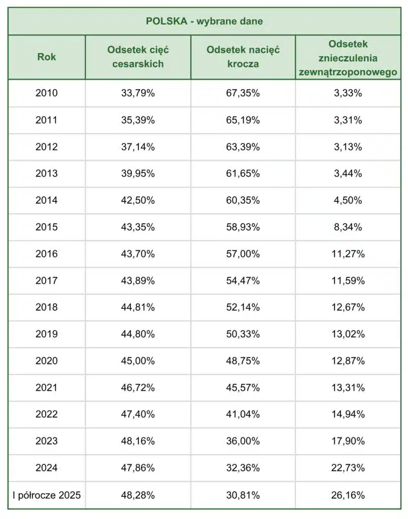 Wielkopolskie dane przedstawiają się gorzej niż ogólnopolskie – w I półroczu 2025 r. odsetek nacięć krocza wyniósł u nas 40,7% w porównaniu do 30,8% w całej Polsce.